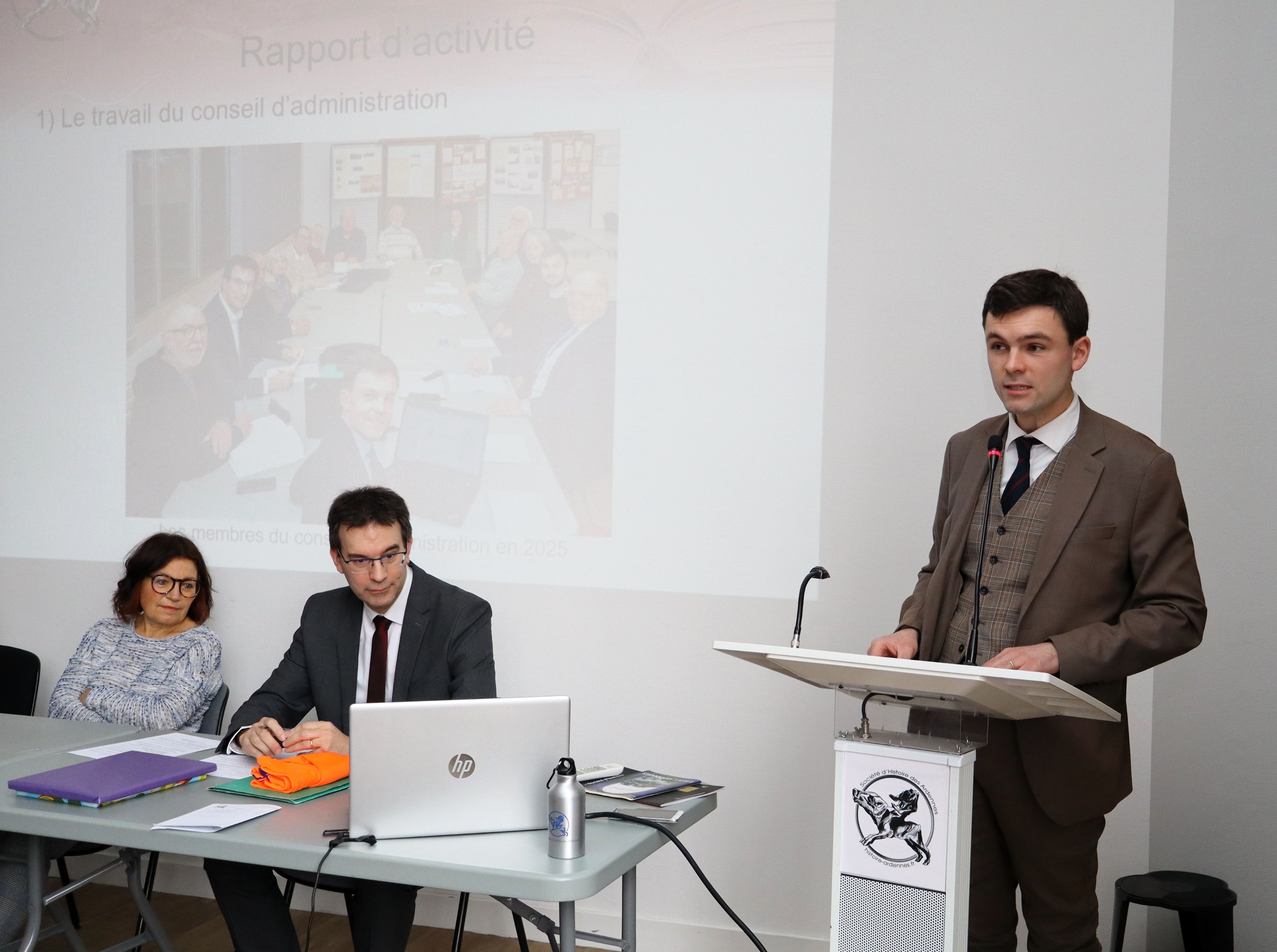 Le président est revenu en particulier sur les nombreuses actions qui ont permis de célébrer le 70e anniversaire de l’association et a présenté aux adhérents un projet de fascicule sur des figures d’Ardennais remarquables mais méconnus. Le rapport d’activité, présenté par le secrétaire général Léo Davy, a permis de retracer les nombreuses activités de la Société : les dix conférences des Vendredis de l’Histoire, les quatre excursions historiques (Châlons-en-Champagne, Bairon, la Semoy et Carignan), ainsi que la parution du Cahier d’études ardennaises n° 30 sur Omont et la préparation de la Revue historique ardennaise n° 57 (2025) que Philippe Moyen, le vice-président aux publications, a présentée à l’assemblée générale. Le rapport financier de la trésorière, Véronique Poggioli, a détaillé la part d’investissement qui avait été faite dans l’exercice 2025 : soirée des 70 ans, frappe des médailles du prix d’honneur à la Monnaie de Paris. À noter que la SHA a renouvelé plusieurs actions de mécénat dont l’octroi d’une bourse d’étude pour deux étudiants.